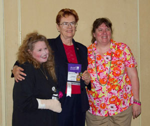 Anne Elizabeth, author of military romance books presented Lindsay McKenna, US Navy (center) with the John P. Baca Congressional Medal of Honor Society coin. Left is Kim Lowe, ROMVET, US Air Force during the SOS celebration at RT Conference.